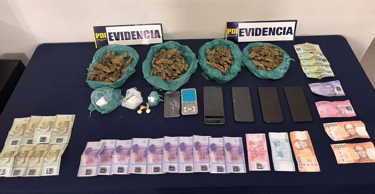 En el procedimiento, oficiales de la PDI incautaron 3 kilos 734 gramos de cannabis a granel, parte procesada y otra en proceso de secado, además de 4,96 gramos de hongos alucinógenos. Asimismo, en el inmueble se encontraron 14 plantas de cannabis, con alturas que fluctuaban entre los 60 centímetros y 1,15 metros. De haber sido comercializada, especialmente en eventos masivos de la región, como los asociados a la Semana Valdiviana, la droga habría alcanzado un avalúo superior a los 25 millones de pesos, equivalente a más de 5.100 dosis que no llegaron a ser distribuidas.